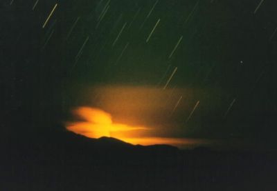 Vulkanausbruch auf dem Salar Ujuni, 3.800 m Höhe. Bolivien Nov.1994 50mm 1:1,7 + Pentax K1000. Ca. 20 Minuten belichtet auf Ektachrome 1600. In der Abendsonne sah die Szenerie so aus: Bild 1 (mit Vulkanausbruch im Hintergrund) und Bild 2 |